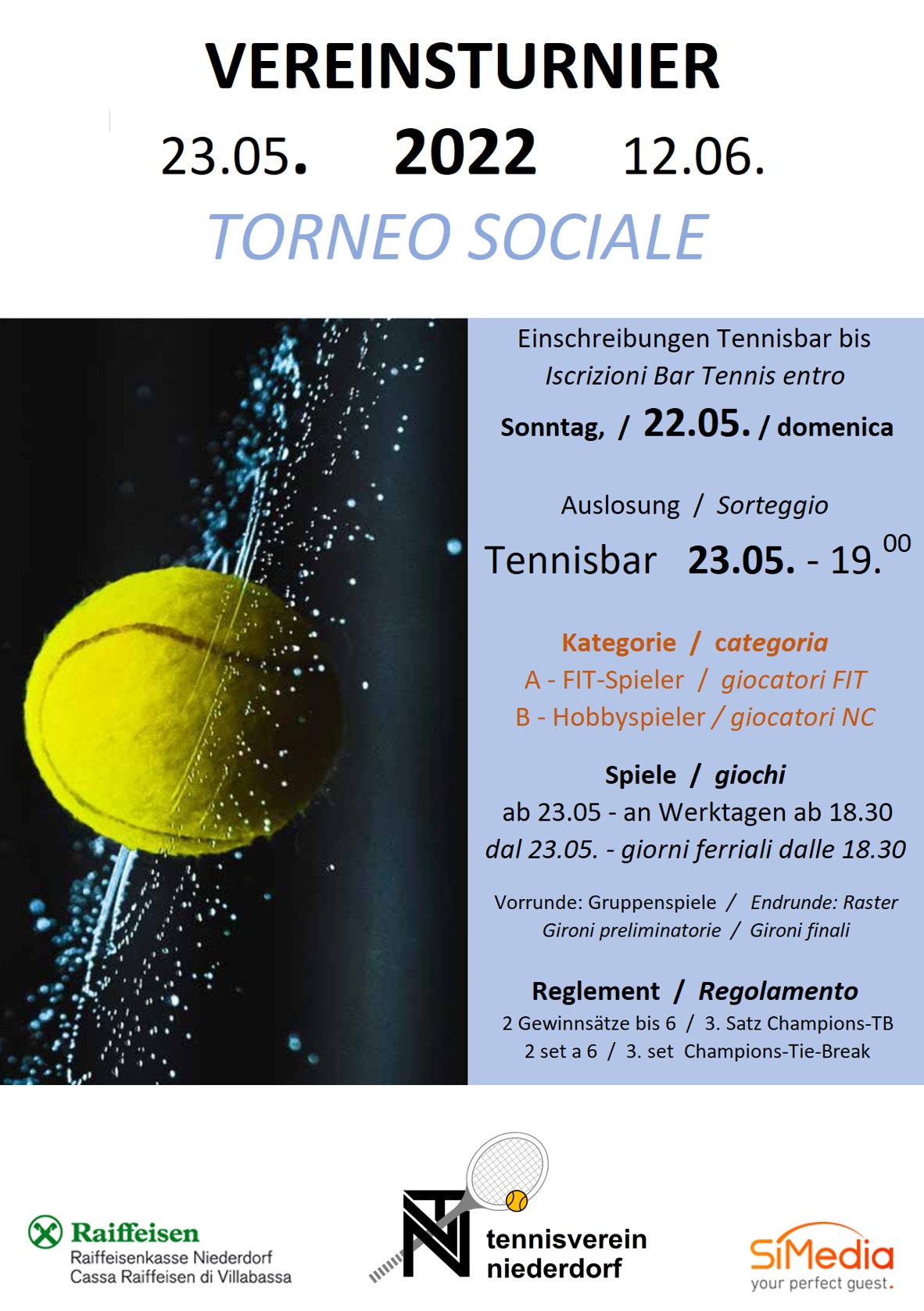 Liebe Vereinsmitglieder! Es ist wieder so weit. Das Vereinsturnier in den verschiedenen Leistungsklassen steht an. Wir warten auf eure Einschreibungen, welche in der Tennisbar gemacht werden können. Die 2 Besten jeder Gruppen ermitteln in einem Finalraster den Sieger. In der Gruppe spielt jeder gegen jeden. Weitere Infos können in der Tennisbar eingeholt werden. EINSCHREIBUNGEN BIS : 22.05.2022 – in der Tennisbar TURNIER-BEGINN : 23.05.2022 – gespielt wird werktags ab 18.30 Der Tennisverein wünscht allen Teilnehmern Viel Spaß und ein gutes Turnier!