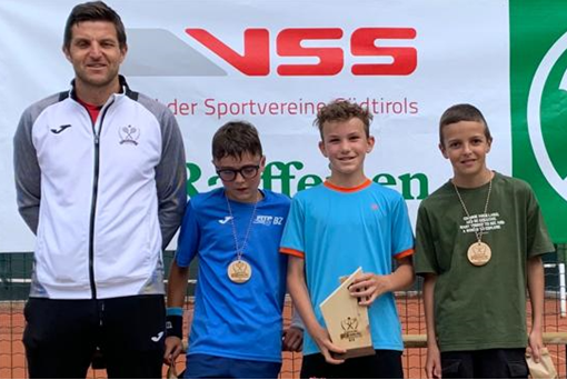 Bei den abschließenden Landesmeisterschaften in St. Georgen des Tennis Promo Grand Prix VSS-FIT/Raiffeisen war Paul Brugger auf dem Siegerfoto mit dabei, mit einem tollen 3. Rang. Es hätte auch mehr drinnen sein können, denn im Halbfinale war er drauf und dran ins Finale vorzustoßen. Nach gewonnenen ersten Satz (4:3) und beim Stande von 3:3 und eigenem Matchball im zweiten Satz rutsche Paul unglücklich aus, und bekam einen Schlag in den Rücken. Mit leichten Schmerzen, vor allem aber etwas geschockt und sichtlich enttäuscht spielte Paul tapfer weiter, aber sein Spielfluss im entscheidendem Tie-Break war gebrochen und er konnte gegen seinen Gegner Lischiotto Patrick vom TC Branzoll das Blatt nicht mehr zu seinen Gunsten wenden. (2:7)