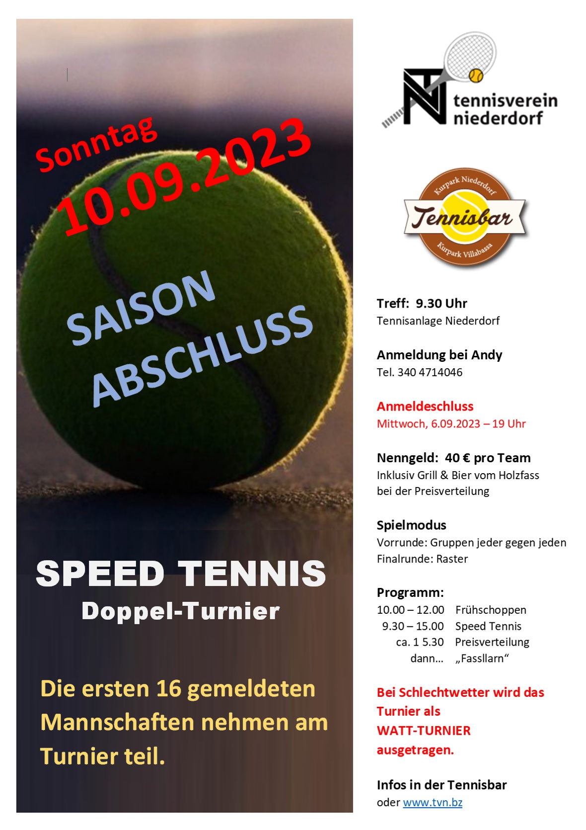 Zum Abschluss der Tennissaison gibt es noch ein Speed-Tennis-Doppelturnier für alle Tennisfreunde. All jene, welche Speed-Tennis noch nicht kennen…. es wird auf Kleinfeld mit weichen Tennisbällen gespielt. Aufgrund der limitiert zugelassenen Mannschaften werden die ersten 16 Meldungen berücksichtigt. Alle Informationen zum Turnier findet ihr auf dem Plakat, bzw. könnt ihr bei Andy in der Tennisbar einholen.