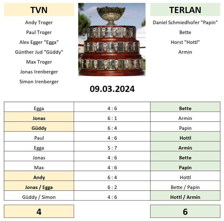 Nach dem Unentschieden des Vorjahres konnte auch dieses Jahr am Samstag, 9. März ein Vergleichskampf mit unseren Terlaner Tennisfreunden organisiert werden. Bevor die Spiele losgingen, servierte Andy Weißwürste mit Senf und Brezel zur Stärkung. Dann gings auf dem Spielfeld ums Eingemachte. Die meisten Spiele endeten mit einem knappen Ergebnis, meist zu Gunsten der „Gäste“. Somit endete auf dem Spielfeld der Vergleichskampf mit 6:4 für Terlan. Zum Abschluss trumpfte Andy mit Feinstem vom Smoker auf und der gesellige Abend ging somit bis spät in die Nacht. Für den 13. April ist das Rückspiel in Terlan angesagt, Zeit für unsere Spieler sich noch in die richtige Form zu bringen. Dank an Andy und Egga für die Organisation.
